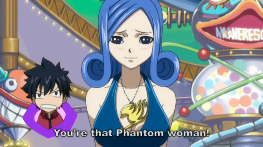 At the casino Juvia approaches Gray, graduating from being a stalker. But not a psychotic or creepy stalker mind you.