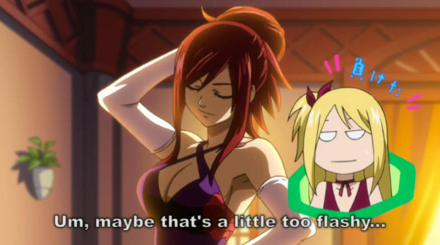 Lucy comes into Erza’s room and invites her down to the casino, where Gray and Natsu are already playing. In a case of anime changes making the original line not make sense, the first I noticed being from Bleach where Matsumoto getting half her torso ripped off (not as graphic as it sounds) getting replaced with the area just being covered in burn marks in the anime, Lucy’s line that Erza’s dress is a little flashy doesn’t make sense, when in the anime Lucy also happens to be wearing an evening gown.