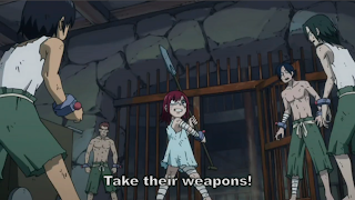 Erza finally snaps and fights back against the jailers once they try to take them back to work. The moment where she convinces the other slaves to fight back is pretty motivational, well written and well scored for the music. Overall it’s a pretty powerful scene, if you can get over how tiny she looks trying to lead a rebellion.