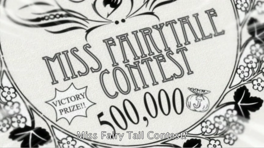 She finds a flier that Happy wanted to give to her, for the Miss Fairy Tail contest. The prize money is 500,000 Jewels, easily enough to cover Lucy’s rent for several months.