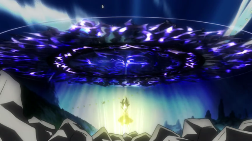 Cana and Juvia chase Freed, who manages to trap them in one of his rune traps. The condition of the enchantment is that they can’t leave until one of them can’t fight. Freed declares that he will take on the winner. He calls Juvia “Phantom woman” declaring that he doesn’t consider her a part of the guild. Juvia, visible hurt by the attack, looks like she’s about to attack Cana and reveal her true colors. But instead she uses the walls of the runes to bounce up to the thunder lachryma, which she attacks, rendering herself unable to fight, and freeing Cana.