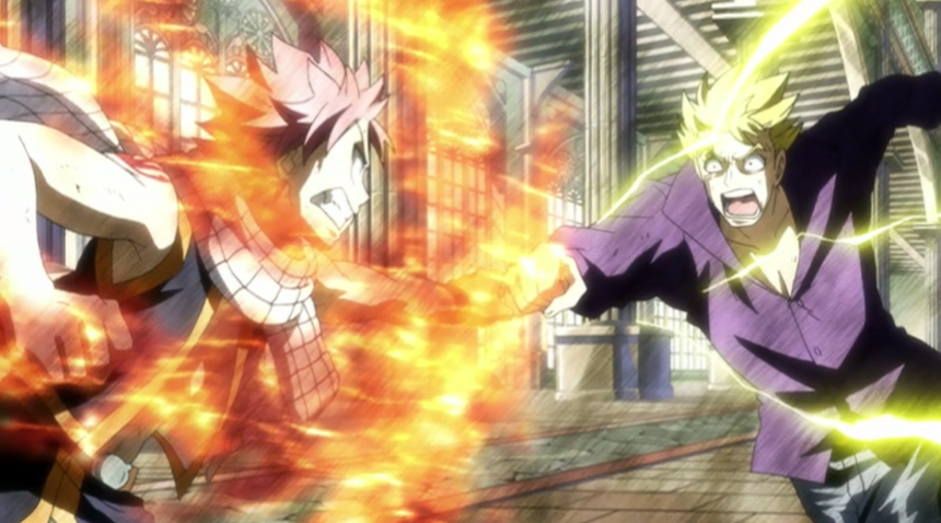 Laxus beats up on Natsu, while at the same time dropping hints that he doesn’t really want to see the town destroyed, as he wonders how long Makarov will take to surrender, and that there is little time left. Natsu tells him that he realizes Laxus doesn’t really want to destroy the town, and because this is most likely true, it just serves to piss Laxus off all that much more.