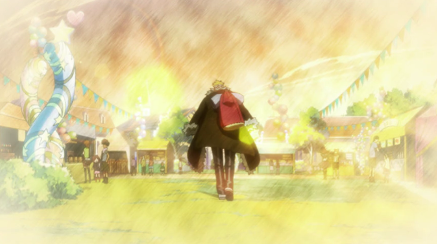 Laxus is watching the Fantasia Parade from the sidelines, along with several supporting characters from previous arcs spread through the crowd. The entire guild has several floats set up. The girls are doing a cheerleader routine.