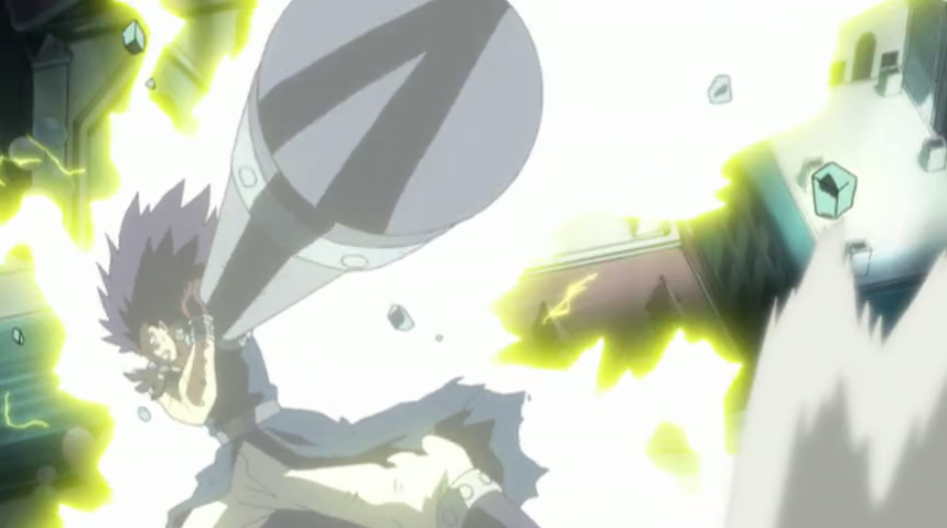 The attack misses, as Gajeel diverts it using his iron as a lightning rod.