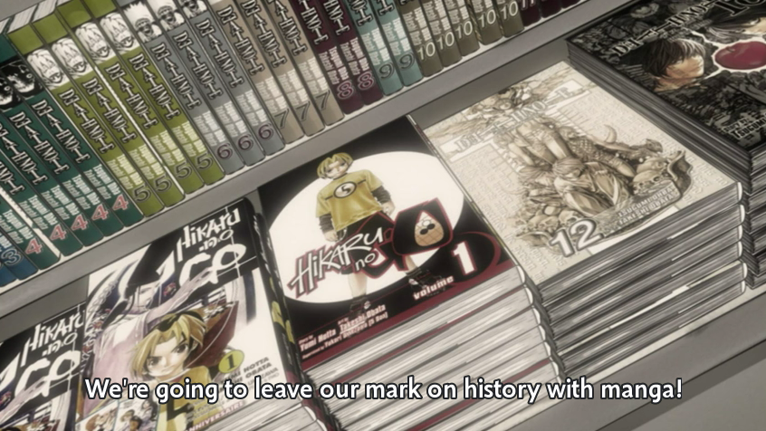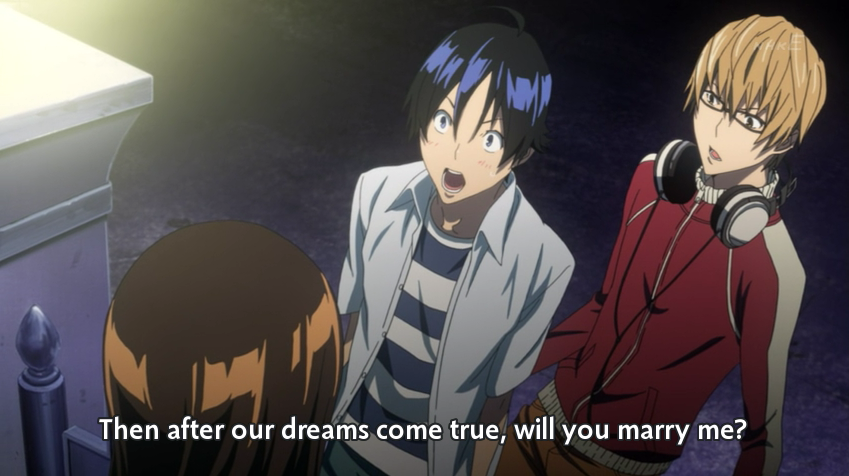 Overall, not a bad adaptation. It improves where improvement was required, tightens up the story quite a bit, while expanding where necessary. Can’t say I’m too impressed by the musical score, but I wasn’t expecting to be. In a series like Fairy Tail music is the lifeblood of action scenes, in a slice of life show like Bakuman it’s role is much more subtle, and as such doesn’t really attract my attention much. But since it’s still the first episode, I’ll withhold judgement on the music until I’ve actually had a chance to hear all of it.