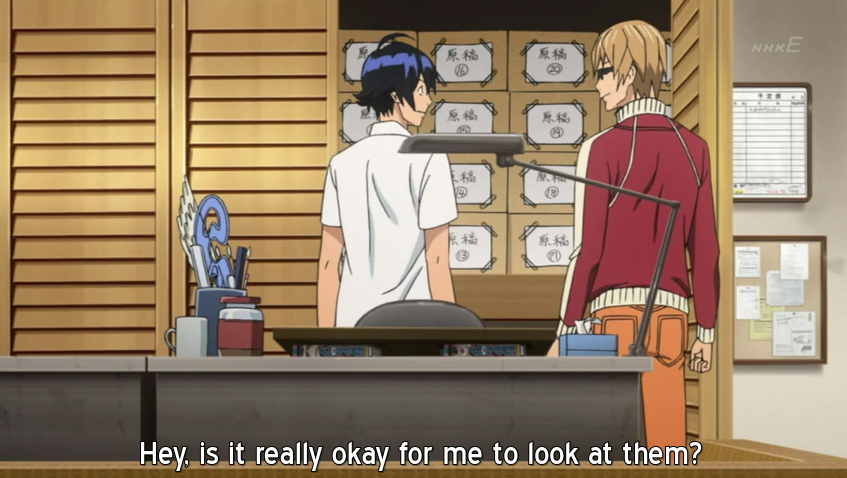 The two of them go over the old names, storyboards, and talk about the process of getting a document submitted to an editor and working with one to get published. They talk about their favorite manga for a while, both deciding that they love manly manga.
