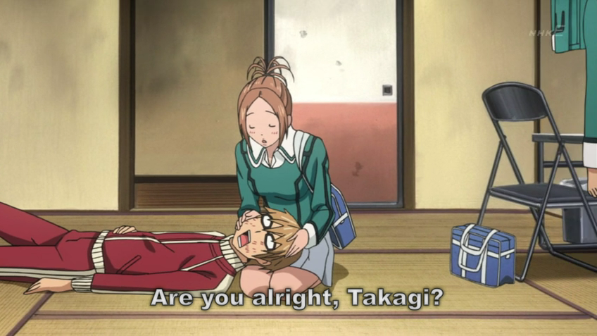 Miyoshi tells him to let her hit him ten times, and that she’ll go out with him after she beats him up for lying to her. So…it’s basically a choice between a domineering girlfriend, or a physically abusive girlfriend. I would say sucks to be Takagi, but then again, he gets more action than I do.
