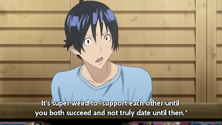 Takagi and Mashiro are joined by Miyoshi, on their usual spot on the roof, who tries to convince Takagi to go on a date with her. Takagi turns her down, reminding her that he told her beforehand he wouldn’t have time for dates if they were a couple. Because, as we all know, to become a manga artist one must first cut off one’s balls.