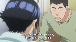 Hattori explains to them that the biggest issue with their work to date is that they don’t have a strong protagonist suited for Jump…sorry, Jack. They discuss several more things, including how much Nizuma has gotten done. Mashiro asks what they need to do to get serialized as quickly as possible. Hattori starts to explain the various factors involved in which works get serialized, when the Editor-in-Chief shows up behind him and says that the only thing a manga needs in order to be serialized is to be good.