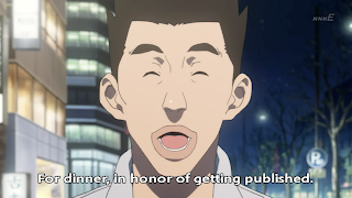 Mashiro and Takagi meet with Hattori to go out to eat, in celebration of getting published. They eat BBQ, and then go back to the office to go over their name, frame by frame.