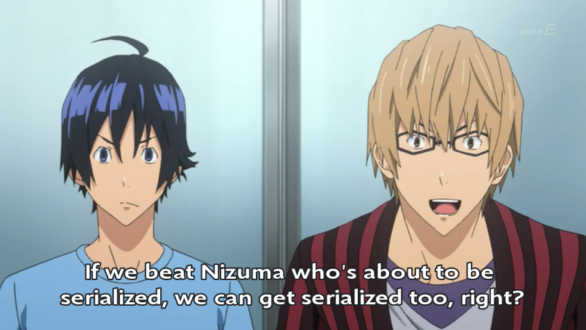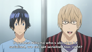 Takagi asks if they can get serialized if they beat Nizum, but Hattori would rather they wait until graduating High School in three years. Mashiro of course insists that they get serialized as quickly as possible. Hattori wonders what the rush is, since he thinks even for Nizuma it’s far too early for him to get serialized.