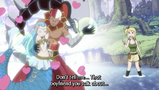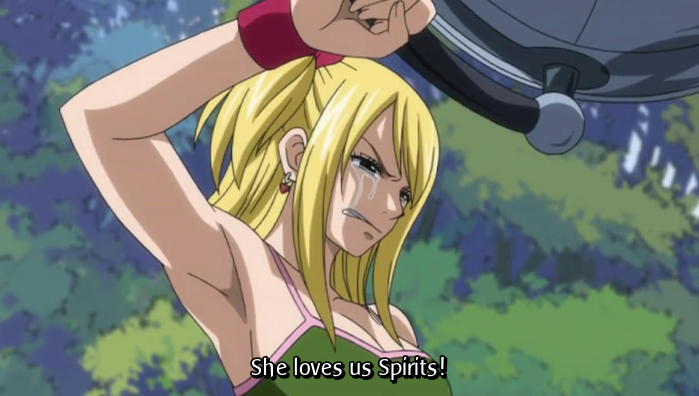 Lucy begs Angel to release Aries, so that she can be with Loke, making her the most adamant Loke/Aries shipper out there. Lucy says that she’ll do anything, except give up her keys, if only Angel lets the two spirits be together. Angel says in that case the price she requires is Lucy’s life, and orders Gemini to use Caelum, transformed into a sword, to kill Lucy.
