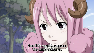 Lucy remembers that she has one more spirit even stronger, and summons Loke. Then Angel summons Aries, Loke’s possibly girlfriend (it’s never really explained, all that is clear is that the two care about each other), and reveals that she was the one who killed Karen, Loke’s former owner, and surprisingly, Hibiki’s former lover.