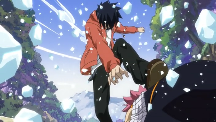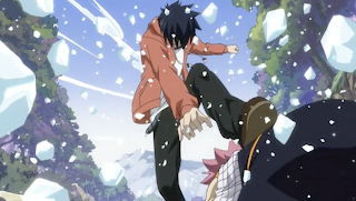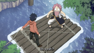 Natsu finds Gray floating in a river, face down, but when he goes to help him discovers that it’s a trap. Gray traps Natsu on a raft, which incapacitates Natsu since it’s transportation. Gray tries to finish off Natsu, but is stopped by Lucy and the others.