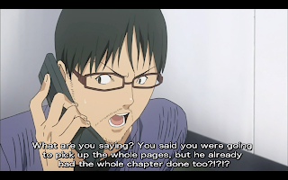 A few years ago I was thinking about characters in fiction and how manga and anime characters would never work in a novel or a movie. In the case of Nizuma I would say that is almost true. The fact that he’s weird is beyond contest, but during this episode there was a poignant moment where he freaks out when his editor disturbs the layout of his drawing desk by putting a cellphone on it. His reaction was to freak out and tell the editor not to touch his stuff. At this point I realized that Nizuma is not just really immature and eccentric, but that he has a very real mental issue. Combine this with his general lack of social etiquette and you have a pretty bizarre character that normally wouldn’t work anywhere but manga and anime.