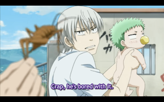 Oga Tatsumi tells his friend Furuichi an embellished tale of how he found a large mustachioed man floating down the river and took a baby from inside the man, after the man split open. The kid gets attached to him and refuses to leave. The problem is that every time he gets upset and starts crying he electrocutes Oga. A lot of the first half of the episode is spent trying to calm the baby down.