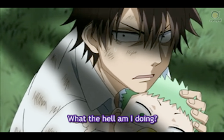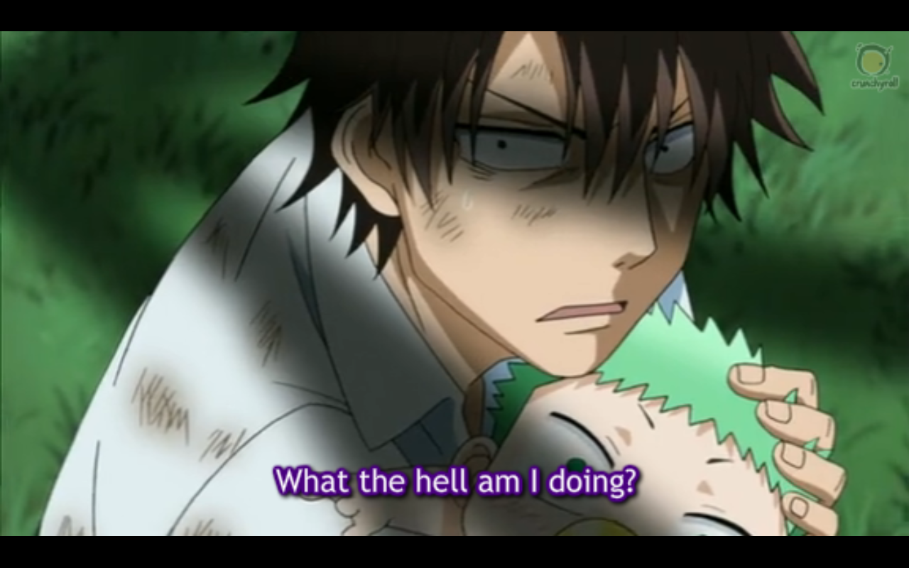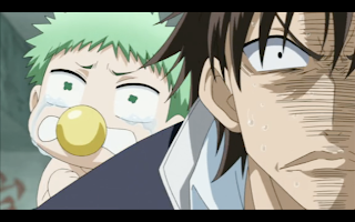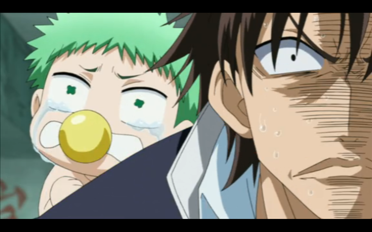 Oga Tatsumi tells his friend Furuichi an embellished tale of how he found a large mustachioed man floating down the river and took a baby from inside the man, after the man split open. The kid gets attached to him and refuses to leave. The problem is that every time he gets upset and starts crying he electrocutes Oga. A lot of the first half of the episode is spent trying to calm the baby down.