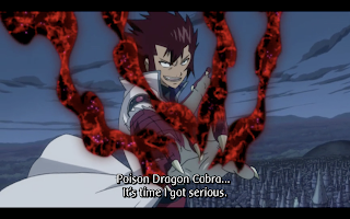 Both Natsu and Happy are poisoned, and Natsu tries a final attack as a desperation move. When that fails he starts screaming in frustration. That scream turns into a roar as loud as any dragon’s roar. Cobra’s sensitive ears can’t handle it, and he is knocked from the sky.