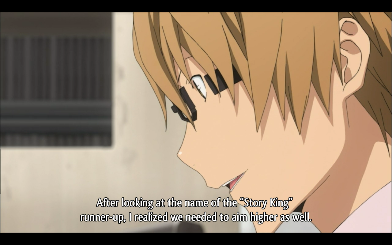 This episode illustrates a crucial fact about Bakuman and slice of life shows in general. It isn’t easy making a series firmly based in reality interesting. If the viewer knows there isn’t going to be any flying around or throwing energy beams at each other, then they’re hard pressed to find anything interesting. Granted I’m slightly biased towards generic shonen action series, but my point stands. Bakuman has suffered as a slice of life series almost specifically because there is only so much you can do with the same characters over and over. The fact that while this episode had more montages than usual but didn’t suffer, is entirely because of the multiple characters that have been introduced. They’re all interesting, and so far well developed characters, so I want to know more about them. It’s a shame that this didn’t happen until this close to the end of season one.