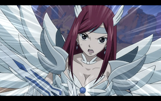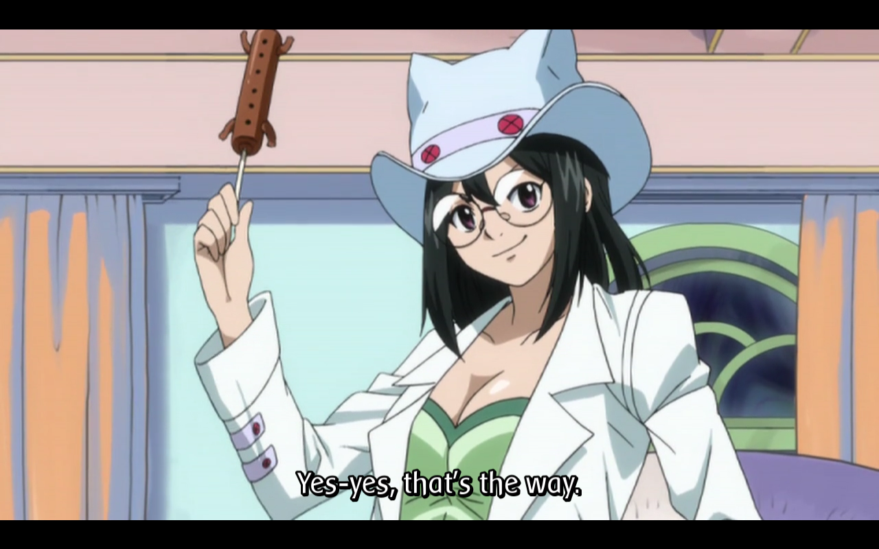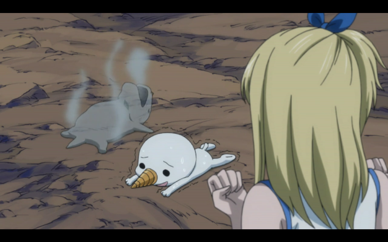 Lucy and Erza manage to beat their opponents; Erza by exchanging weapons faster, and Lucy by bringing out Plue to force the lizard-man to dance himself to exhaustion. Guess it pays to have such a feeble spirit around. It’s interesting to note that they go back to the stock animation of Lucy summoning her spirits, but actually bothered to reanimate it.