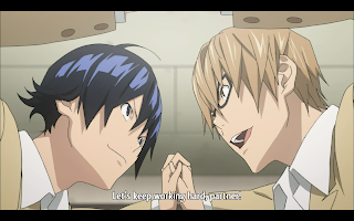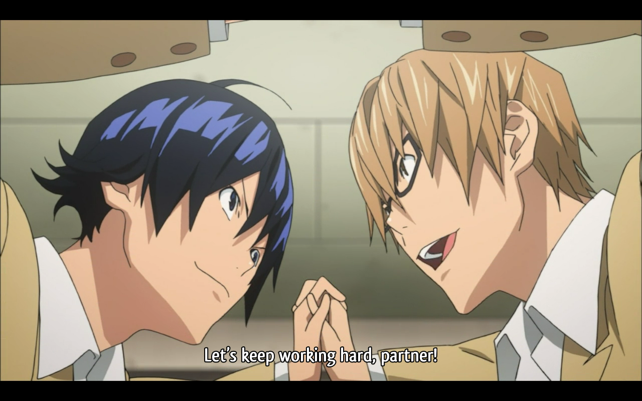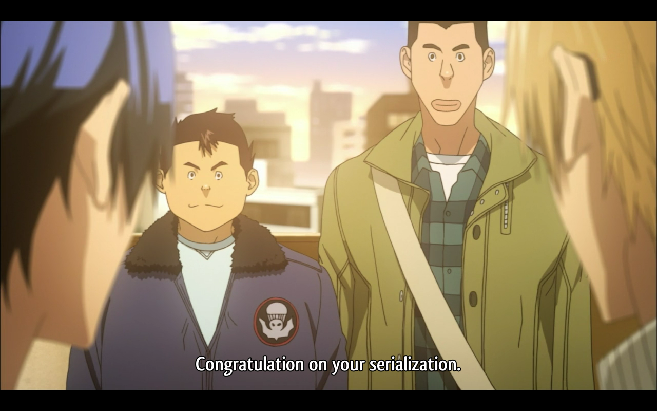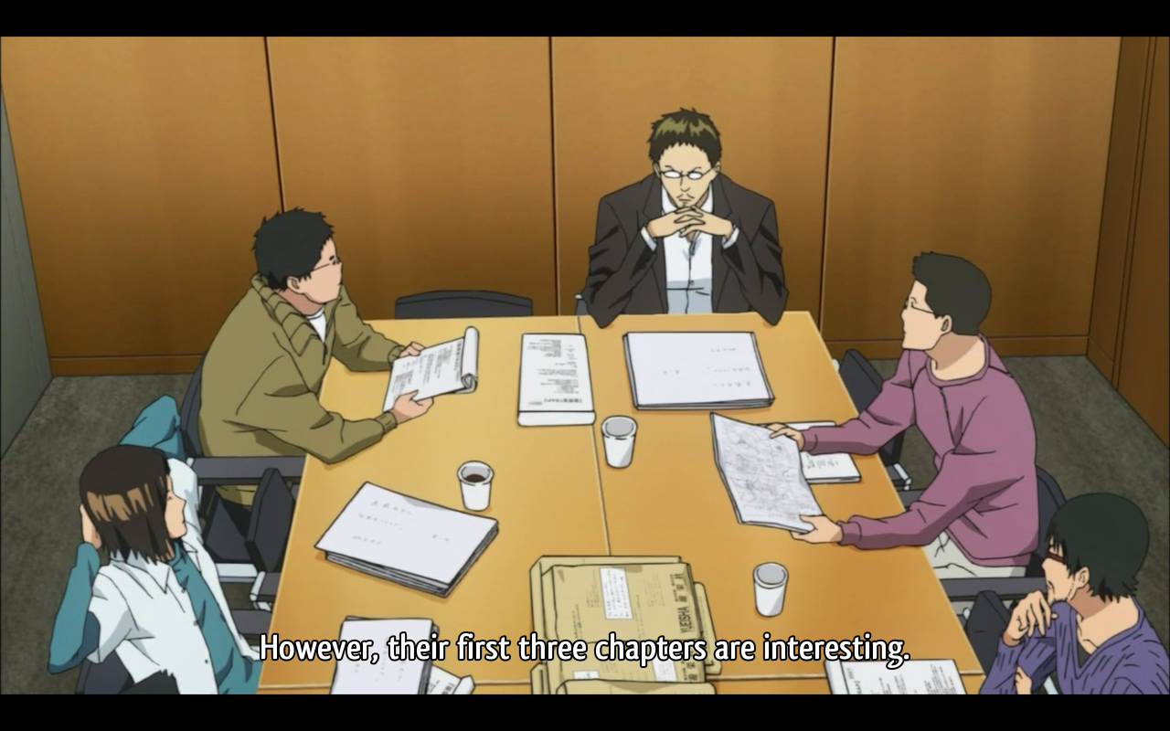 In usual Bakuman fashion, little actually happens in the episode. The majority of this episode covers the serialization meeting, which would be far too dull if I were to summarize it. The anime does manage to keep things interesting by at first playing the ending theme in the background, and then by focusing on the plot important details only.
