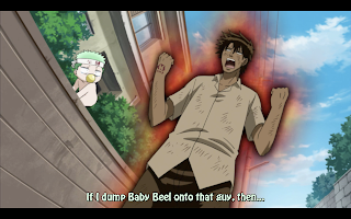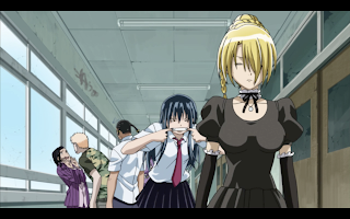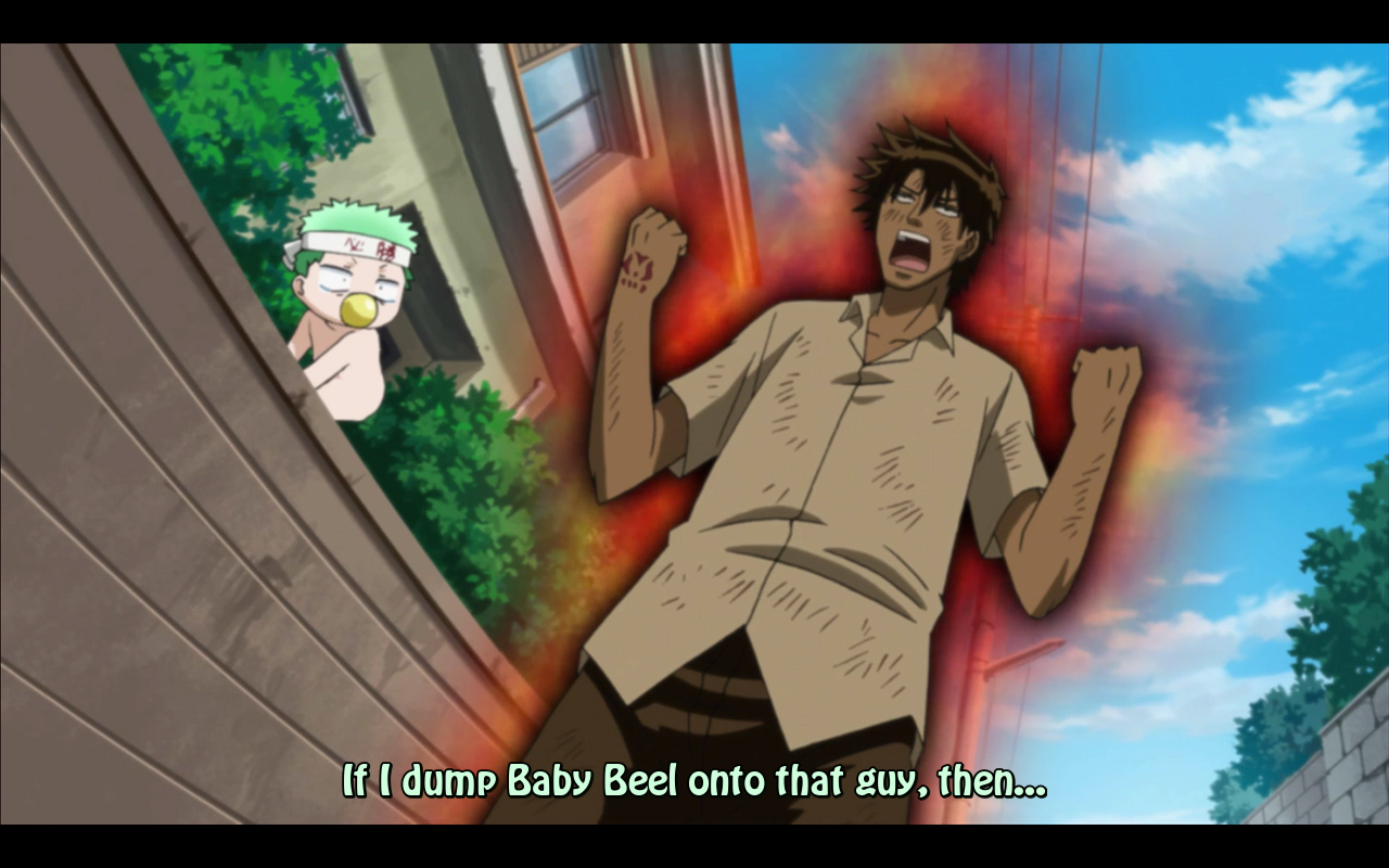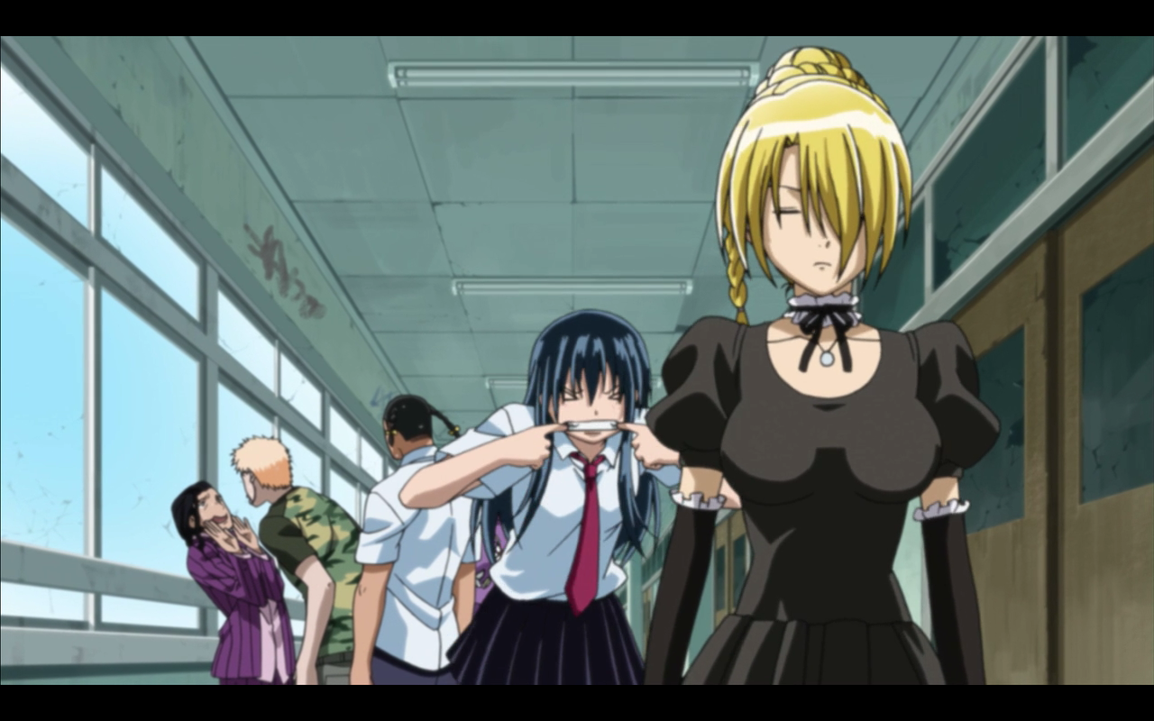 Turns out everyone is phenomenally stupid, as some of them even cheat off others while for signing their name. A rival school invades, and Oga goes off to fight them so the others can take the test. Through some plot convenience his energy or something or other fuses with Beel’s, so all the guys he beats up count towards Beel’s test. Well, I’m sure this will come up again at some future junction in the anime.