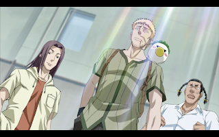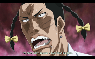 The episode starts with Kanzaki–the yogurt one, for those who were wondering–training a new special technique. Unfortunately for him he has not yet figured out how to do a dropkick with both feet at the same time. Natsume shows up with a laptop on which he has video footage of Oga’s fights. Shiroyama, the dude who kinda looks like the Chief’s daughter, realizes that Oga’s strength comes from carrying Beel on his back all the time.