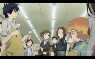 Rin goes to get a job at a grocery store, and this scene I like a lot better. Rather than continuing to tell the viewers how Rin can’t hold a job, the anime instead lets us see exactly why he can’t hold a job. He’s clumsy, and messes things up, and I think that he exhibits supernatural strength, which becomes a bit more of a hindrance. In the end however he shows he can make crappy, cheap noodles taste better, and he gets the job.