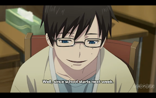 Maid and Butler dialogue is when characters discuss things they already know and normally would not be talking about, if it weren’t for the fact that the audience needs to be informed. Such as how Yukio is the studious one, and Rin is the one who always gets into trouble, and how Yukio wants to be a doctor, etc. Dialogue like this is not only unrealistic, but tiresome and clumsy. It’s the kind of thing a beginner storyteller indulges in. For some it’s enough to drive them away, but not I! For I still have an entire review to write, and I’m still hoping for more music like that in the opening.