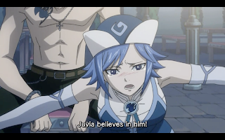When Gray wakes up the rest of the guild turns on him for betraying them; except for Juvia, who defends him, saying no matter what she’ll believe in him. I liked this scene a lot because, sad to say, it shows a more serious side to Juvia’s character and her feelings than the manga does. This episode has heart, it’s taking itself seriously, and doing it well! Juvia is acting true to her character in a very serious situation, and all the characters are acting very much in character.