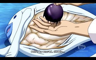 After they finish the puffer whale, a strange creature comes out of the lagoon, dragging a whole bunch of puffer whales with him. Both Toriko and Coco instantly go into battle mode, but the creature just ignores them. The episode ends with the creature making its way out of the cave and killing some thieves that were waiting to ambush some gourmet hunters that brought puffer whales with them.