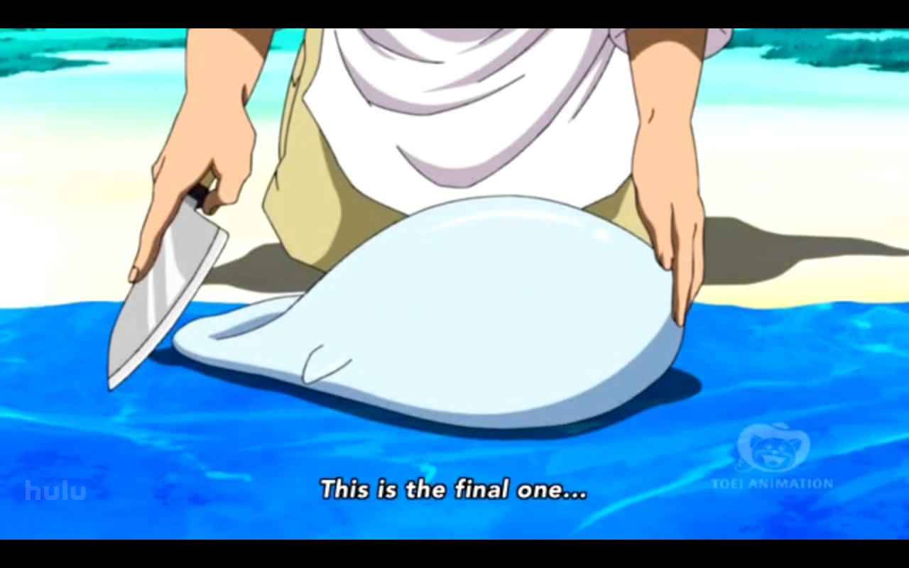 A notable part of this episode is two moments where it varies from the manga. There is a fair bit of minor variation, what with Toriko succeeding in catching a puffer whale on his second try here, as opposed to failing even once he gets the handle of how to properly catch the whales. The biggest change however is that the anime has Toriko giving Komatsu earplugs, and then Komatsu losing them. In the manga Toriko never gives Komatsu those earplugs, and Komatsu dying is literaly Toriko’s fault. Because he didn’t consider that anything loud enough to scare off monsters, would probably be loud enough to kill a human instantly. Another, smaller moment, is when Komatsu asks Toriko to get the ingredients he needs to treat Jiro to a feast as thanks for saving his life. In the manga Toriko flat out refuses, in the anime he runs off ahead without hearing what Komatsu said. So instead of being a lethally thoughtless jerk, anime Toriko is instead more just thoughtless, and not so much of a jerk. Since I assume the anime is aimed at a younger audience than the manga, I’m not sure how that works, but anime adaptations tend to cut down on violence and fix minor unlikable character traits. Or maybe they thought that this early on in the game for the anime they wanted to make their main character more likable.