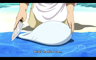 They manage to get about ten of the whales, and after failing to extract the poison from one of them, Coco has Komatsu–whose hands are a bit more steady–to prepare the rest. Coco coaches Komatsu through the process, and with the tenth, and final, puffer whale, they manage to get it open and remove the poison sack.