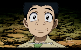 After they finish the puffer whale, a strange creature comes out of the lagoon, dragging a whole bunch of puffer whales with him. Both Toriko and Coco instantly go into battle mode, but the creature just ignores them. The episode ends with the creature making its way out of the cave and killing some thieves that were waiting to ambush some gourmet hunters that brought puffer whales with them.