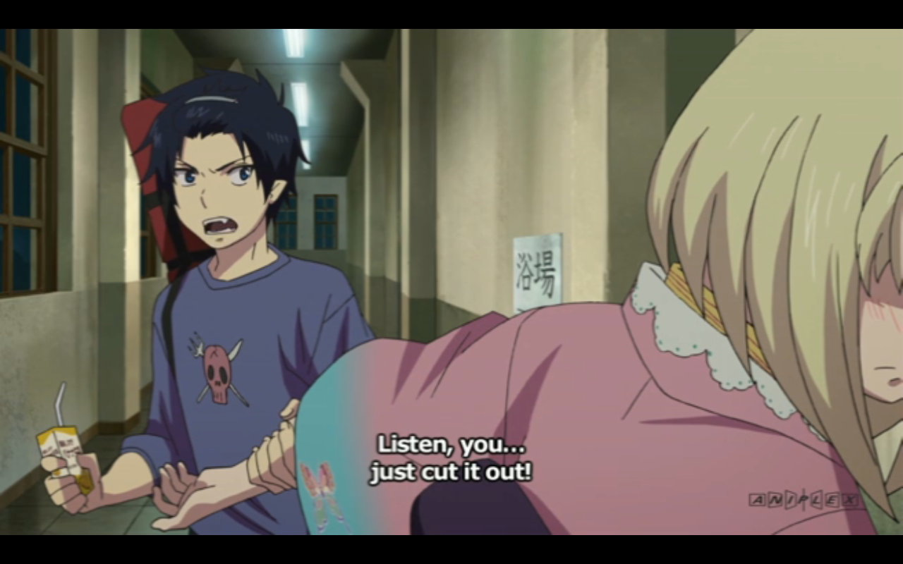 When Shiemi tries to make friends with the other two girls in the exorcist cram school, things backfire a little when Izumo Kamiki takes advantage of her and basically turns Shiemi into a personal servant. Not that Shiemi minds, she’s just glad to help out her friend. Rin on the other hand notices how Izumo is treating Shiemi, and he doesn’t like it.