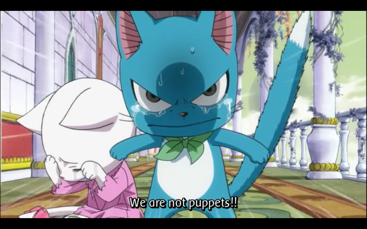 The reveal that Happy and Charle are actually interdimensional assassins, while essentially ludicrous (could anyone seriously think either of them could take on even the weakest of dragonslayers (ie/ Wendy)?) is milking the characters for more pathos than I would have thought possible. Who knew two fuzzballs could actually come close to making me feel something? Who knew indeed…