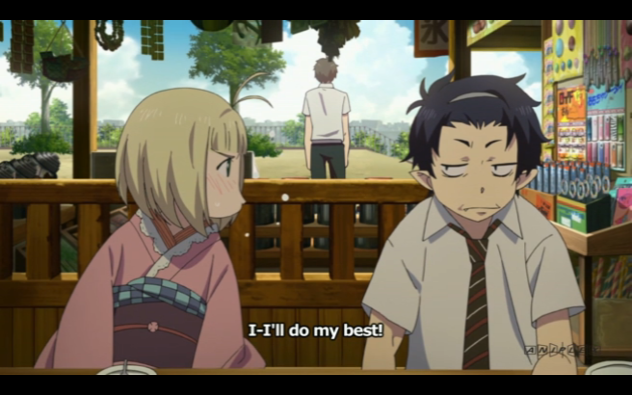 Shiemi makes her way up to the roof, and starts healing Rin from the ghoul’s temptaint he is infected with. She tearfully tells Rin that she’s decided (to become an exorcist), though Rin has no idea what she’s talking about.