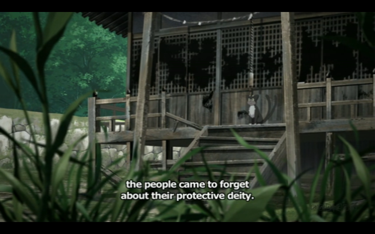 Yukio recalls how Shiro tamed Kuro, who used to be worshipped as a god, protector of silk worms. When the silk trade collapsed, people forgot about Kuro. Then his temple got destroyed by a construction crew, and Kuro started attacking people.
