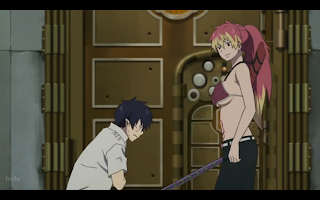Shura takes Rin in for questioning. She uses her keys to get to the local headquarters, where Mephistopheles claims that Fujimoto was raising Rin to be a weapon against Satan. Shura takes Rin into a private room, where she begins to “interrogate” him.