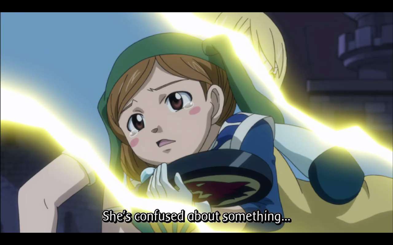 Lucy manages to get to Natsu on the roller coaster, but the two of them are driven into a pool. Lucy tries to use Aquarius, but Hughes’ control extends even to the water, and Aquarius is powerless.