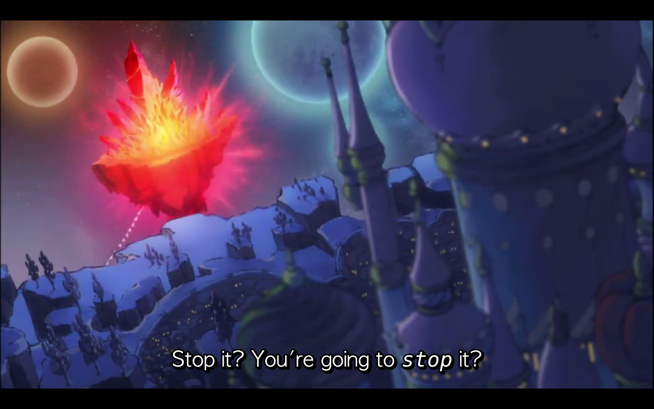 Queen Shagot joins her people, but with only one wing (how is she flying in the first place?) she can’t stay in the air and falls. Lily catches her, and he too is overcome with emotion, claiming that despite being exiled he still loves his home. They all get together and manage to push back the lachryma. When they repel the island a flash of light erupts from the lachryma, and it is sucked back up into anima.