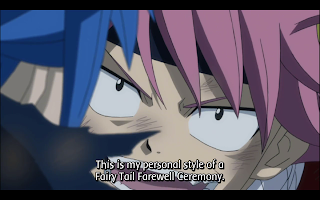 Mystogan tries to use his magic, but it too gets drained by the reverse anima. In the eyes of the people he is the lone hero with no magic, facing against the power of a demon lord’s magic. They fight for real, though Natsu holds off on using his magic, to make it look as realistic as possible. While they trade blows, Natsu starts his version of the Fairy Tail Farewell Ceremony.