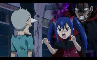 Edolas Gajeel gets the plan, and starts helping out by inciting the crowd. Gajeel wreaks havoc with his powers, while Wendy needs a little help scaring people.