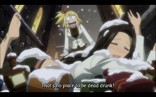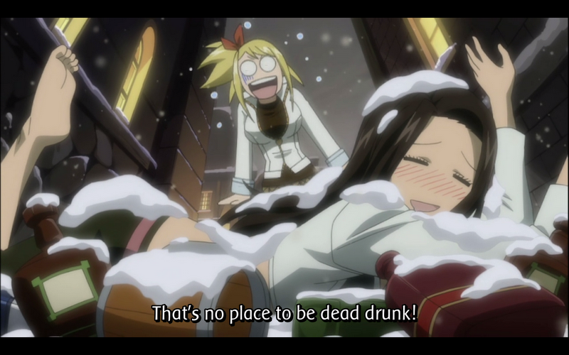 Lucy finds Cana buried by snow in an alley, and takes her home. Cana explains that she’s failed to pass the exam several times, and that if she can’t become S-Class she will leave the guild. Because she needs to be S-Class to meet a certain person. Cana explains her reasoning to Lucy, but the dialogue cuts out and is replaced by a very fitting new piece of music. The explanation leaves Lucy in tears, and declaring that she will be Cana’s partner.