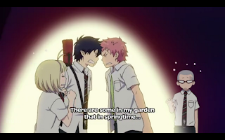 Shima asks Shiemi and Izumo for their birthday and blood type. With this, he can tell girls their fortune. Rin asks for his fortune only to be turned down as Shima tells him that it only works with girls. While the two get into a silly argument, Shiemi notes that Izumo’s birthday is coming up soon.