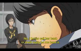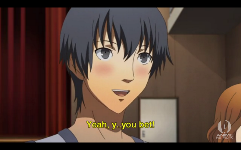 She proceeds to force him to skip class, and hound him at all times. When she calls him after class he immediately hangs up on her, but calls her back right afterwards, afraid she’ll be pissed at him. Chie is pissed that Ai is hogging Yu all the time, since they can’t get any investigation done without him around.