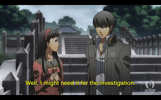After getting away from Kanji, they decide that they need to keep a watch on Kanji and the textile shop. Yosuke asks Yukiko for her phone number, so he can contact her for the investigation team. Yukiko doesn’t address the request, but instead comments that she needs to go buy tofu.