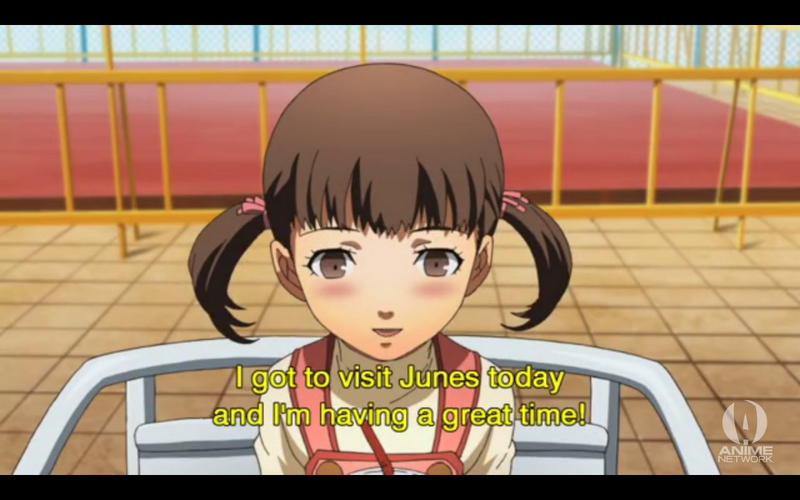 This was a goofy episode, and frankly I loved it. The end was a strange mood change, from relatively serious, to balls to the walls insane. I get the feeling that Persona 4 The Animation is trying to establish an identity for itself aside from that of the game. Right now it’s in an experimentation stage. But what it can always rely on is how darn cute Nanako is.