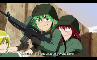 The rest of the class head to Himekawa’s where they get ready to play End of War 4, a first person shooter. After taking forever to make usable avatars, they end up wasting all their practice time, and have to jump into the game blind. Despite most of them not knowing how to play.