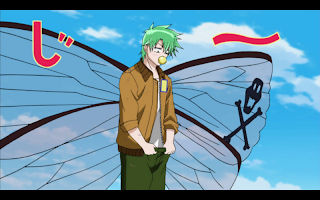 Despite Saotome’s warning not to stay in that form for more than five minutes, or to use it more than once, Oga drinks from the milk again, and fully fuses with Beel. His hair turns green, and he grows fly wings, as well as Beel’s pacifier. With Beel’s influence, he tries to take his pants off, to the horror of his friends.